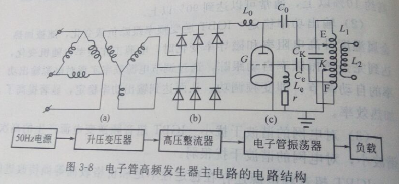(1)電子管高頻發生器的電路結構 圖3-8表示電子管高頻發生器的主電路。從圖3-8中可知,電子管高頻發生器由升壓變壓器A,將電網三相380V交流電升壓到10kV供給高壓整流電路B,整流后的高壓直流電(6-15kV)經濾波器L0供給電子管振蕩電路C,最后得到f=200-300kHz的單相高壓高頻電流,經降壓后供給負載。